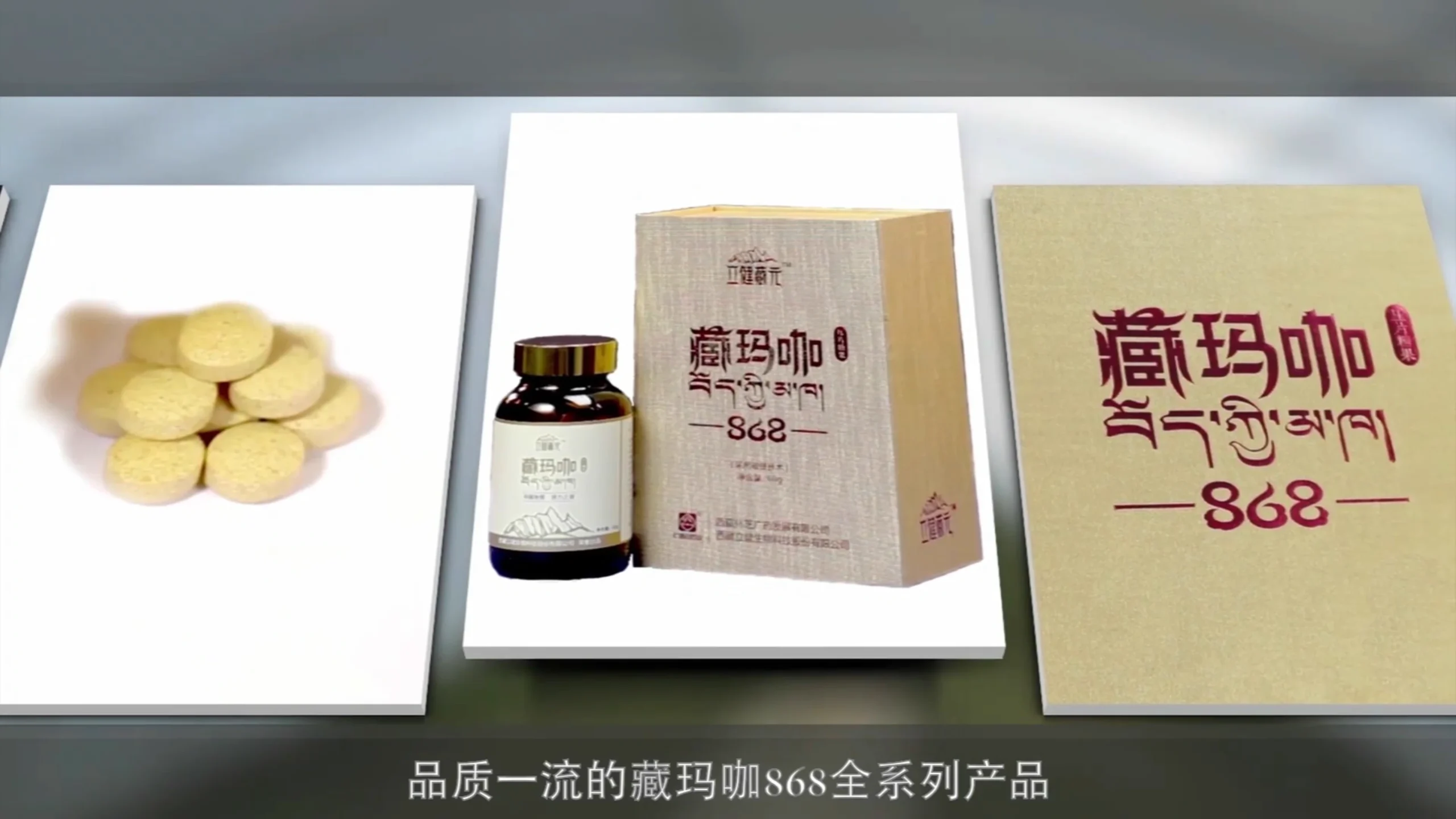 Still from the Maca 868 product presentation video for Lijian Zangyuan (立健藏元), featuring packaging and health supplement presentation in China